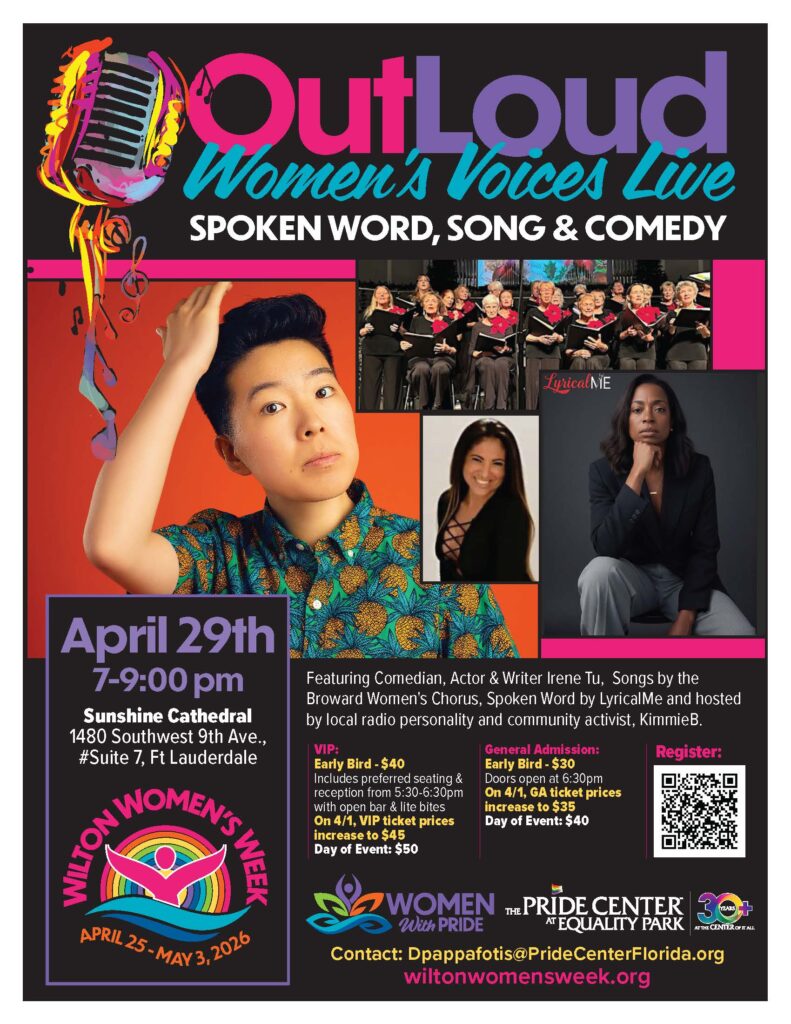 Hosted by beloved radio personality KimmieB, the evening begins with moving spoken word from local poet LyricalMe, whose powerful messages sets the tone for the night. We’ll then be lifted by the harmonies of the Broward Women’s Chorus, celebrating community and connection through song. Closing out the evening is comedian, actor and writer Irene Tu, bringing sharp wit and laugh-out-loud humor to the stage.